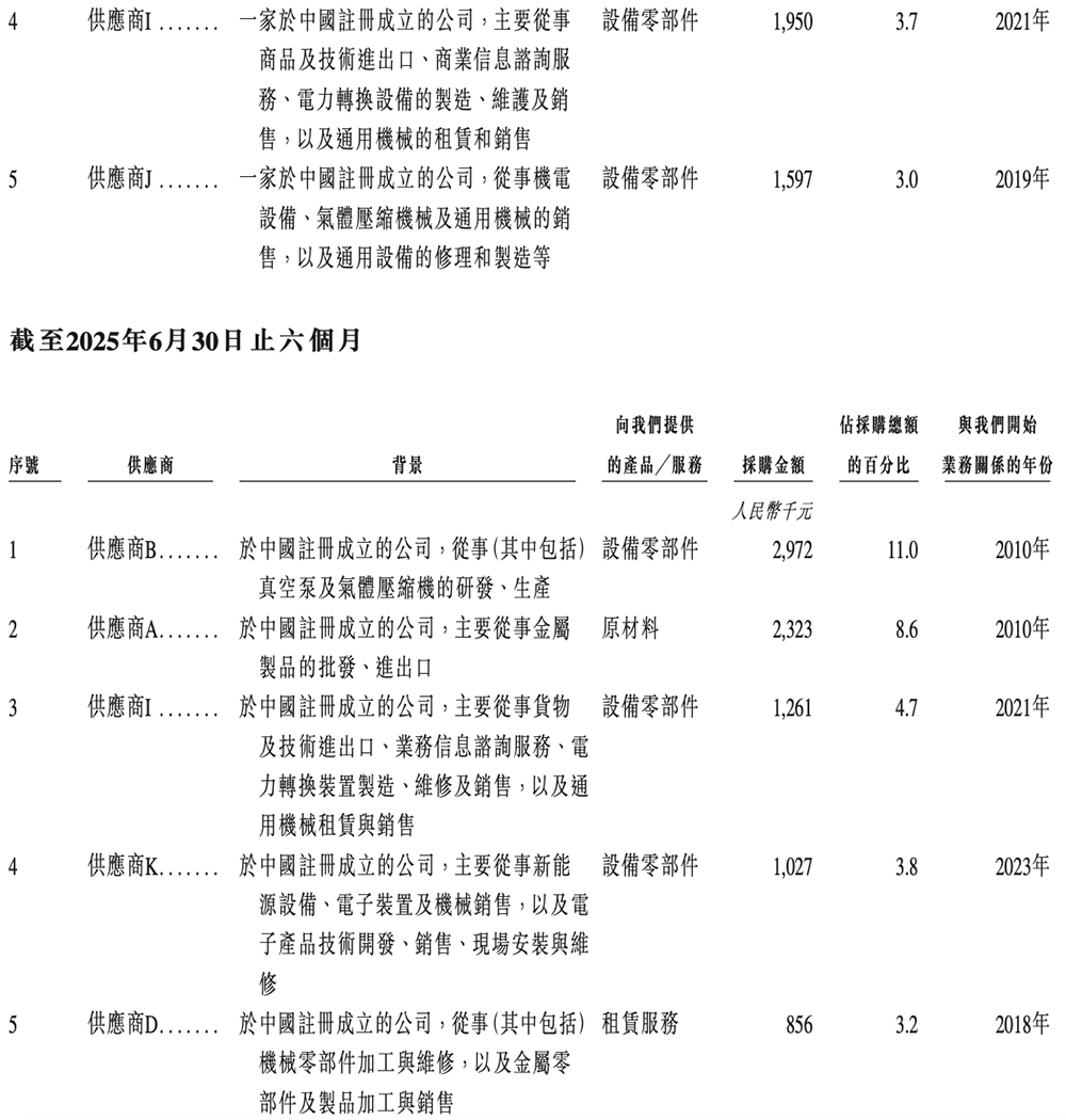 2022年、2023年、2024年、2025年1-6月,该公司向五大供应商的采购额分别占总采购额的25.7%、25.9%、30.7%、31.3%。