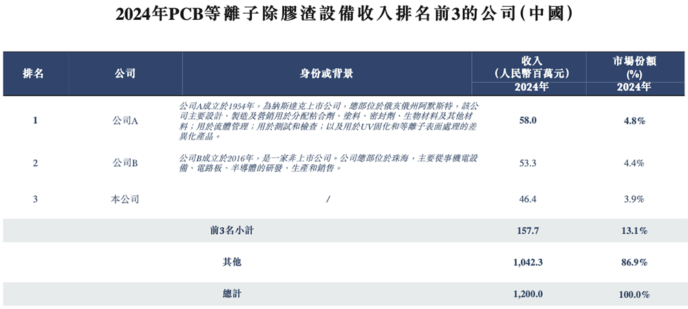 根据弗若斯特沙利文报告,按2022年至2024年各年于中国产生的收入计,宝丰堂在中国PCB等离子除胶渣设备市场排名前三;按2024年于中国产生的收入计,宝丰堂在中国PCB等离子处理设备的市场份额约为3.9%。