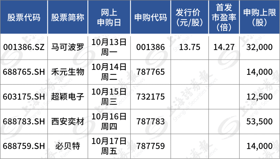 据目前安排,若无变化,下周(10月13日至17日)有5只新股可申购,分别为科创板3只、沪深主板各1只。