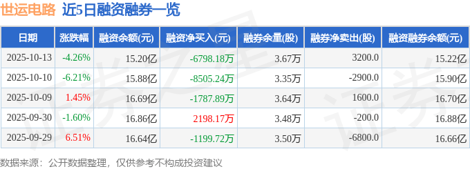 证券之星消息,截至2025年10月13日收盘,世运电路(603920)报收于41.53元,下跌4.26%,换手率4.35%,成交量31.34万手,成交额12.92亿元。