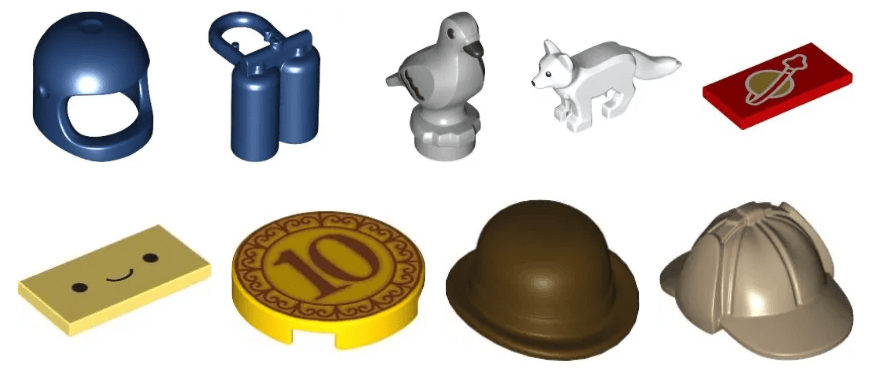 比如来自城市组的北极狐,21358 小人仔扭蛋机的印刷 10 元硬币,夏洛克·福尔摩斯与华生医生的帽子。