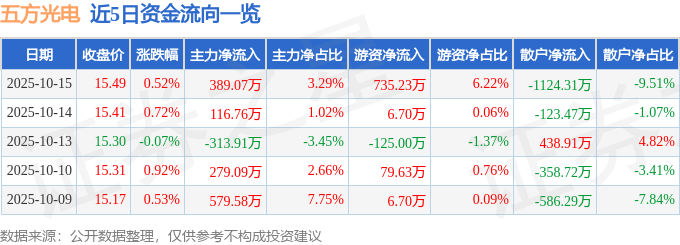 证券之星消息,截至2025年10月15日收盘,五方光电(002962)报收于15.49元,上涨0.52%,换手率3.65%,成交量7.63万手,成交额1.18亿元。