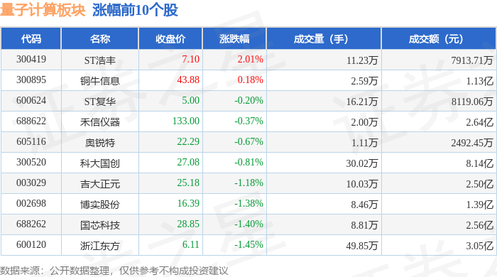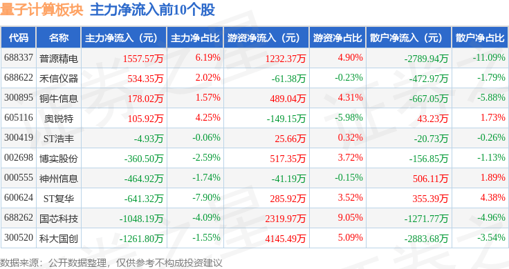 从资金流向上来看,当日量子计算板块主力资金净流出6.2亿元,游资资金净流入3.04亿元,散户资金净流入3.17亿元。量子计算板块个股资金流向见下表: