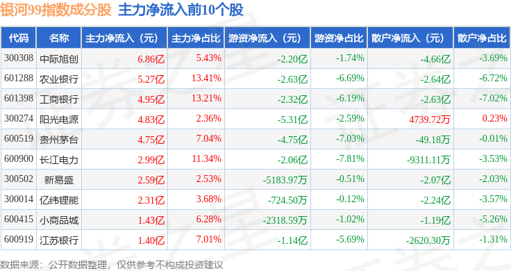 资金流向方面,银河99(000959)指数成份股当日主力资金净流出合计46.88亿元,游资资金净流入合计13.33亿元,散户资金净流入合计33.55亿元。成份股资金流向详情见下表: