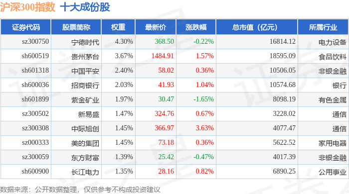 证券之星消息,10月16日,沪深300(000300)指数报收于4618.42点,涨0.26%,成交5605.67亿元,换手率0.76%。当日该指数成份股中,上涨的有137家,阳光电源以7.66%的涨幅领涨,下跌的有156家,华大九天以4.59%的跌幅领跌。