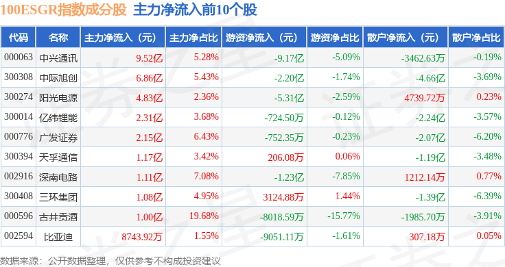 资金流向方面,100ESGR(470027)指数成份股当日主力资金净流出合计46.1亿元,游资资金净流入合计5.42亿元,散户资金净流入合计40.68亿元。成份股资金流向详情见下表:
