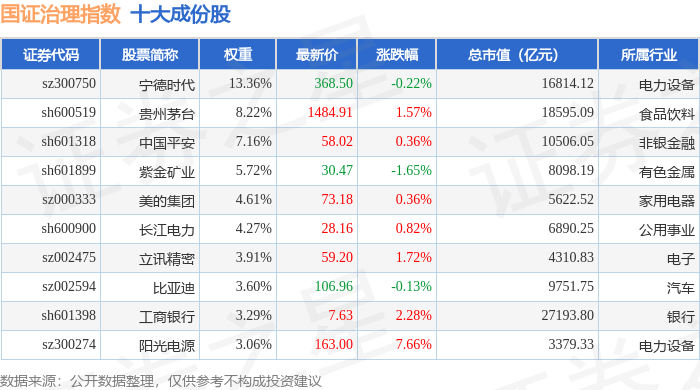 国证治理(399322)指数十大成份股详情如下: