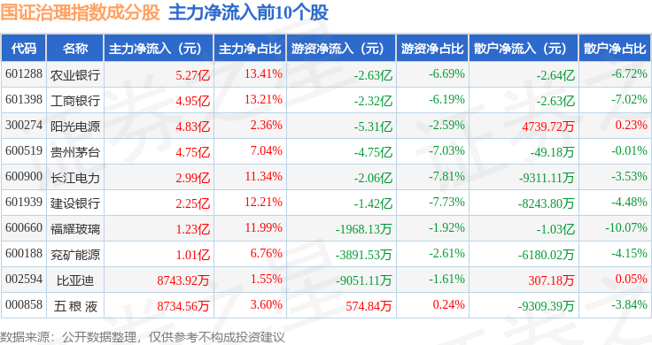 资金流向方面,国证治理(399322)指数成份股当日主力资金净流出合计20.31亿元,游资资金净流出合计6427.78万元,散户资金净流入合计20.95亿元。成份股资金流向详情见下表:
