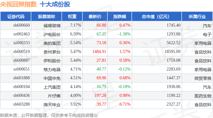 证券之星消息,10月16日,央视回报(399553)指数报收于7425.45点,涨0.01%,成交403.56亿元,换手率1.17%。当日该指数成份股中,上涨的有24家,法拉电子以5.28%的涨幅领涨,下跌的有25家,恒立液压以4.48%的跌幅领跌。
