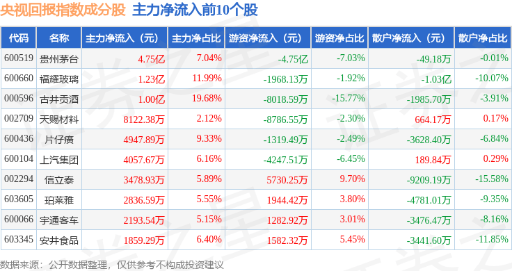 资金流向方面,央视回报(399553)指数成份股当日主力资金净流出合计5.85亿元,游资资金净流出合计8388.69万元,散户资金净流入合计6.69亿元。成份股资金流向详情见下表: