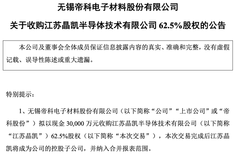交易完成后,江苏晶凯将成为帝科股份的控股子公司,正式纳入合并报表范围。