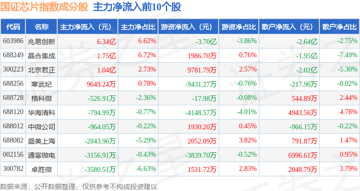 资金流向方面,国证芯片(980017)指数成份股当日主力资金净流出合计34.08亿元,游资资金净流入合计15.15亿元,散户资金净流入合计18.93亿元。成份股资金流向详情见下表: