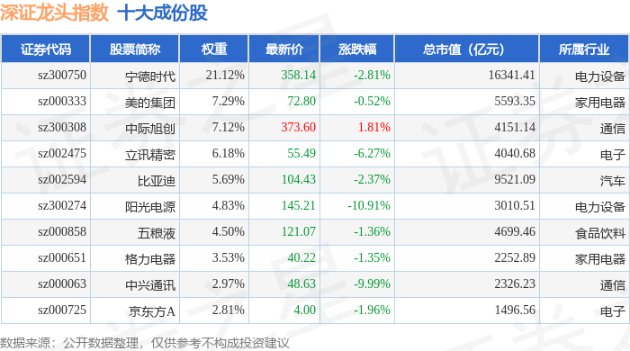 证券之星消息,10月17日,深证龙头(399653)指数报收于2912.46点,跌2.68%,成交1341.09亿元,换手率1.67%。当日该指数成份股中,上涨的有7家,中际旭创以1.81%的涨幅领涨,下跌的有43家,阳光电源以10.91%的跌幅领跌。