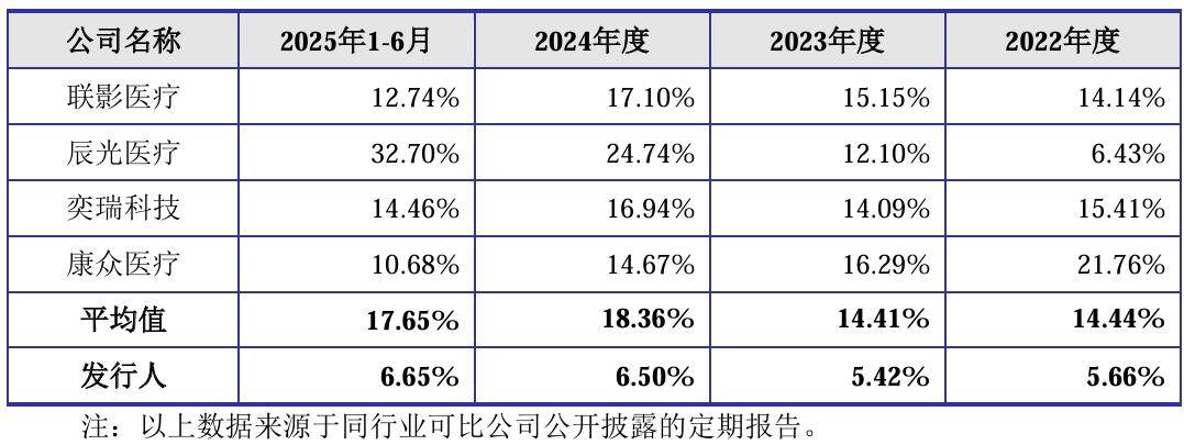 报告期同期,健信超导的研发费用率分别为5.66%、5.42%、6.50%和6.65%,这一数值远不及同行业均值的14.44%、14.41%、18.36%和17.65%,同时与其同行业可比公司普遍的高研发投入形成了鲜明对比。