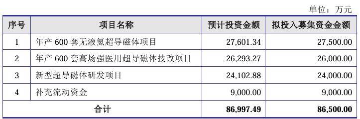 一片质疑声中,健信超导调整了募资方案,最新招股书(上会稿)显示,其9000万元补流项目被删除,募资规模也减少至7.75亿元,分别用于年产600套无液氦超导磁体、年产600套高场强医用超导磁体技改和新型超导磁体研发项目。