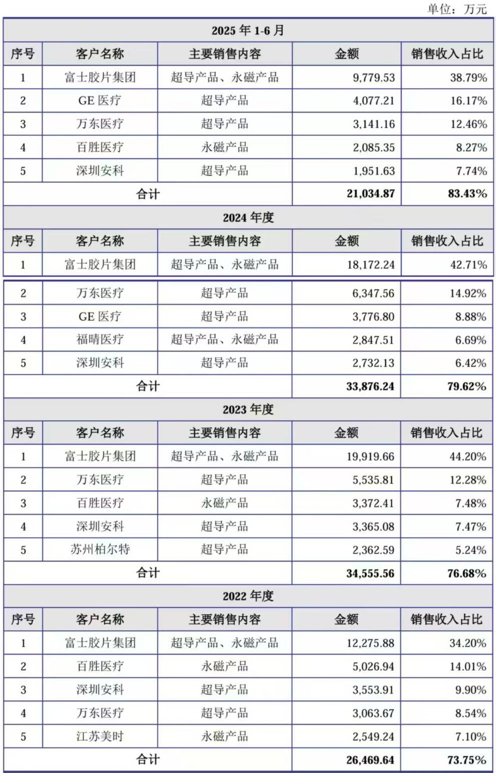 但需要注意的是,健信超导的主要客户相当集中,报告期内来自前五大客户的收入分别为2.65亿元、3.46亿元、3.39亿元和2.10亿元,占比分别达到73.75%、76.68%、79.62%和83.43%,其中第一大客户富士胶片集团占比稳定在30%以上。