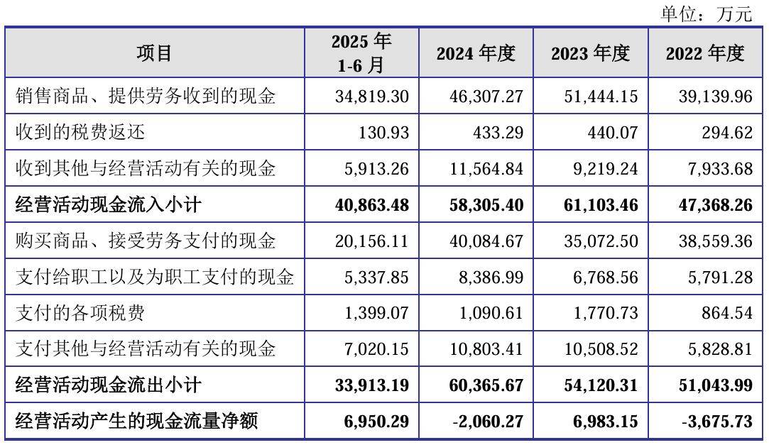 健信超导的现金流状况也相当严峻,报告期各期该公司经营活动产生的现金流量净额分别为-3675.73万元、6983.15万元、-2060.27万元和6950.29万元,曾在2022年、2024年两度出现现金流出情况。