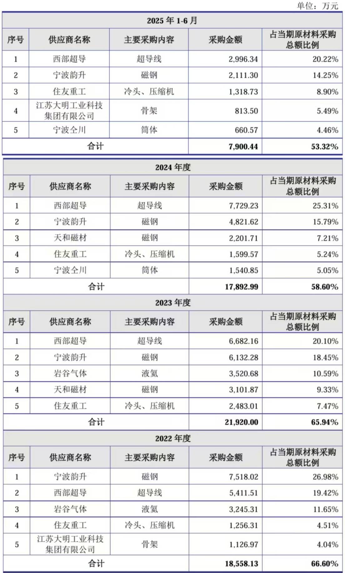 虽然健信超导表示其不存在严重依赖单一少数供应商的情形,但该公司的供应商集中度也当仁不让,报告期内向前五大供应商的采购金额占比分别达到66.60%、65.94%、58.60%和53.32%,其中宁波韵升、宁波仝川还与该公司存在关联关系。