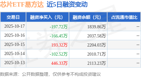 证券之星消息,10月17日,芯片ETF易方达(516350)融资买入532.39万元,融资偿还730.11万元,融资净卖出197.72万元,融资余额1839.86万元,近20个交易日中有11个交易日出现融资净买入。