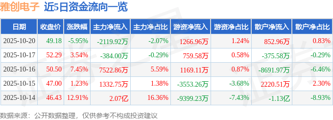 证券之星消息,截至2025年10月20日收盘,雅创电子(301099)报收于49.18元,下跌5.95%,换手率22.89%,成交量20.55万手,成交额10.26亿元。