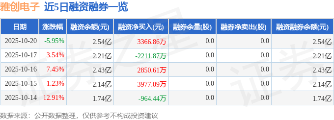 雅创电子融资融券信息显示,融资方面,当日融资买入1.15亿元,融资偿还8098.22万元,融资净买入3366.86万元。融券方面,融券卖出0.0股,融券偿还0.0股,融券余量0.0股,融券余额0.0万元。融资融券余额2.54亿元。