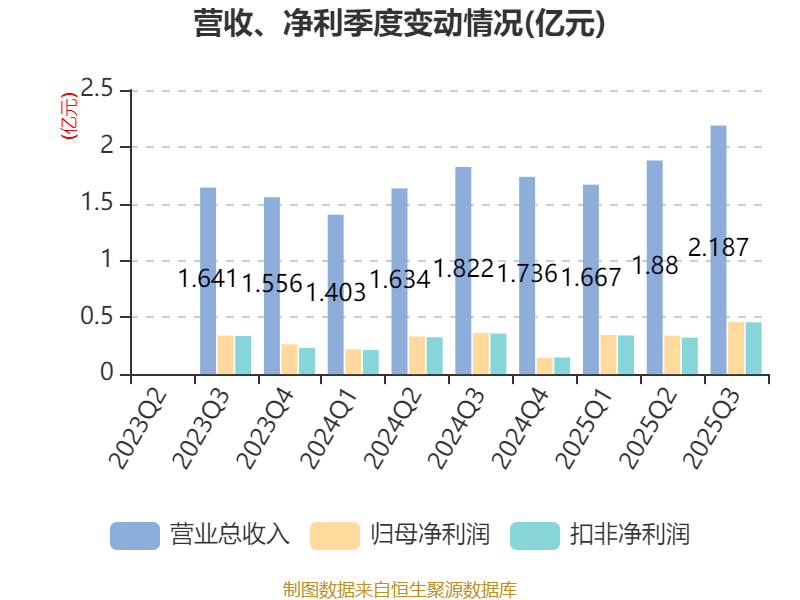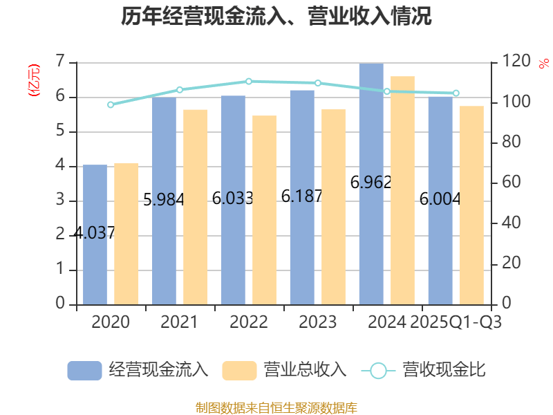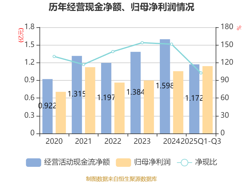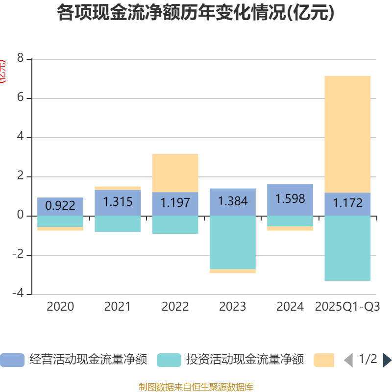 2025年前三季度,公司经营活动现金流净额为1.17亿元,同比增长5.08%;筹资活动现金流净额5.95亿元,同比增加6.09亿元;投资活动现金流净额-3.33亿元,上年同期为-4198.1万元。