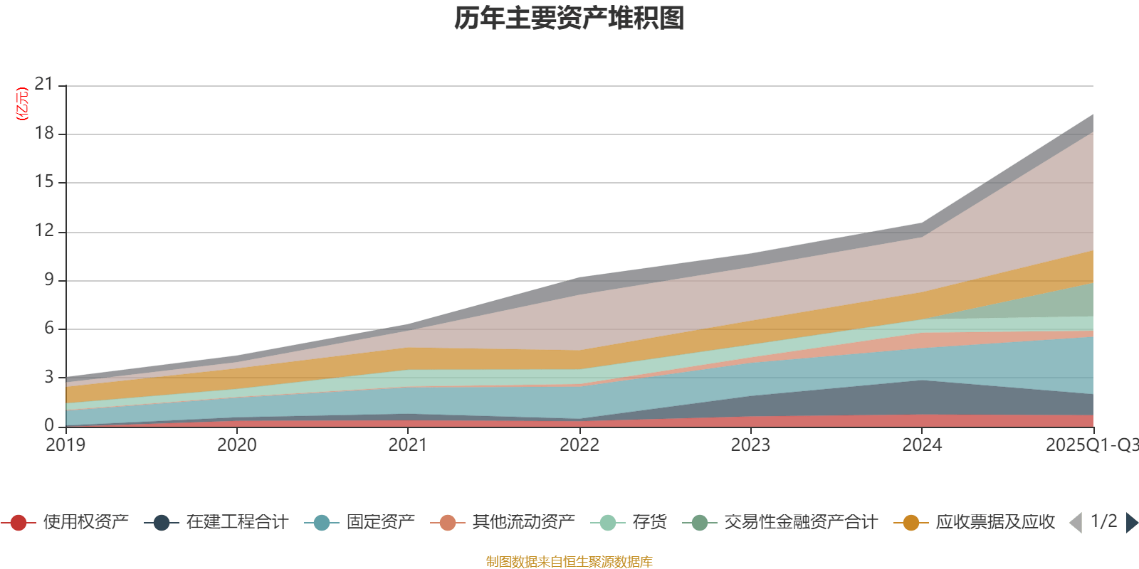 资产重大变化方面,截至2025年三季度末,公司货币资金较上年末增加115.76%,占公司总资产比重上升11个百分点;交易性金融资产合计占公司总资产的10.67%,上年末为0;在建工程合计较上年末减少38.87%,占公司总资产比重下降10.09个百分点;其他流动资产较上年末减少60.65%,占公司总资产比重下降5.67个百分点。