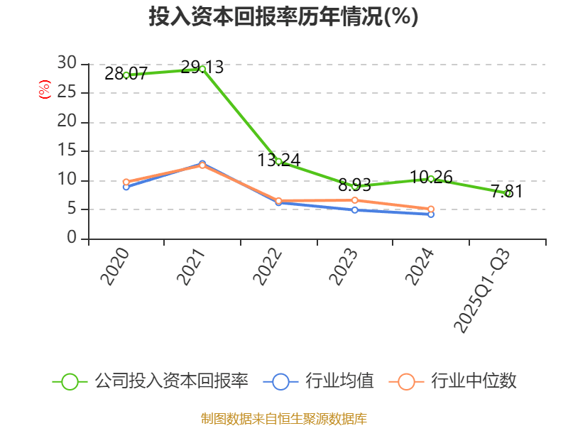 盈利能力方面, 2025年前三季度公司加权平均净资产收益率为7.36%,同比下降2.83个百分点。公司2025年前三季度投入资本回报率为7.81%,较上年同期下降1.18个百分点。
