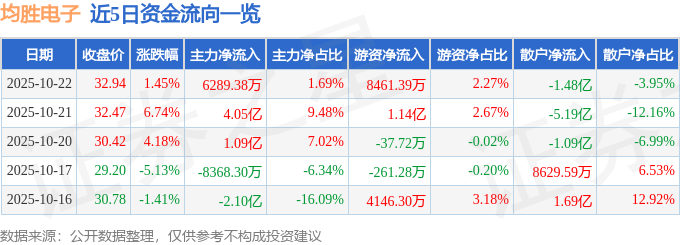 10月22日的资金流向数据方面,主力资金净流入6289.38万元,占总成交额1.69%,游资资金净流入8461.39万元,占总成交额2.27%,散户资金净流出1.48亿元,占总成交额3.95%。