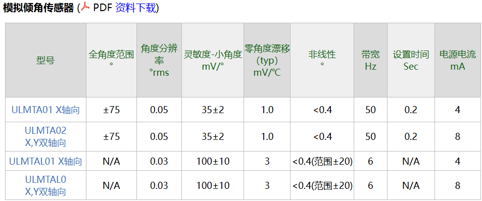 - 模拟倾角传感器共同指标: