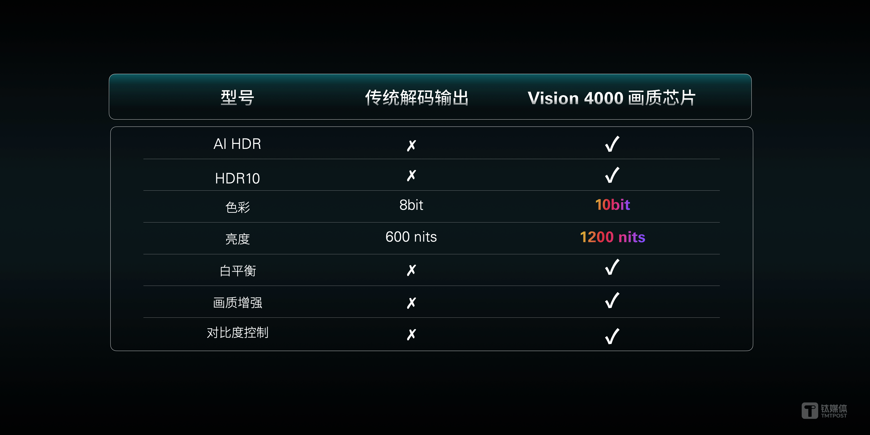 众所周知,HDR代表着高动态范围的画面能力,是现代屏幕设备上,提升画质的关键因素之一。基于这颗Vision 4000芯片,雷鸟Air 4系列在显示方面首次支持HDR10画质,带来两倍亮度动态,1200nits亮度输出,并支持10.7亿色彩输出,相比传统8-bit丰富度提升64倍。