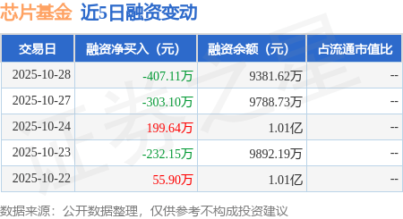 证券之星消息,10月28日,芯片基金(159801)融资买入1582.45万元,融资偿还1989.56万元,融资净卖出407.11万元,融资余额9381.62万元,近20个交易日中有12个交易日出现融资净买入。