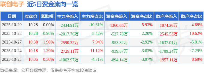 10月29日的资金流向数据方面,主力资金净流出2434.91万元,占总成交额10.61%,游资资金净流入1360.65万元,占总成交额5.93%,散户资金净流入1074.26万元,占总成交额4.68%。