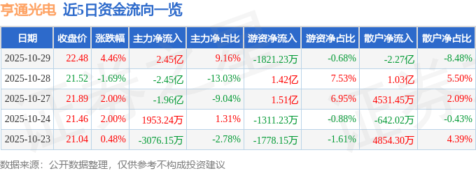 证券之星消息,截至2025年10月29日收盘,亨通光电(600487)报收于22.48元,上涨4.46%,换手率4.89%,成交量119.51万手,成交额26.71亿元。