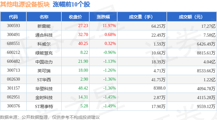 从资金流向上来看,当日其他电源设备板块主力资金净流出22.27亿元,游资资金净流入4.87亿元,散户资金净流入17.4亿元。其他电源设备板块个股资金流向见下表: