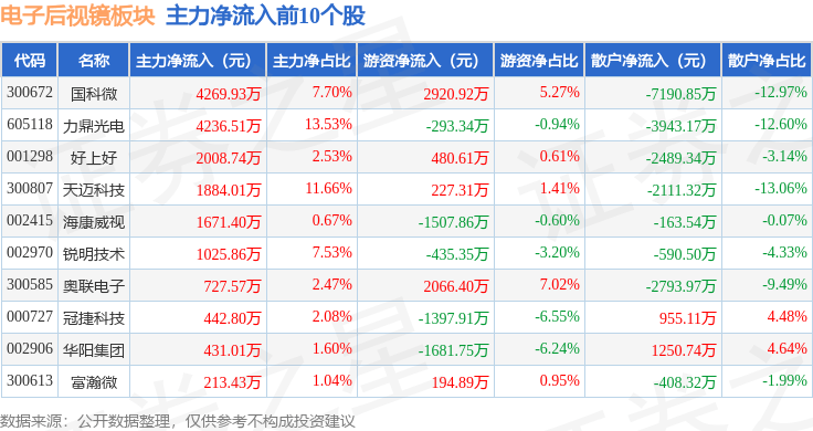 从资金流向上来看,当日电子后视镜板块主力资金净流出26.52亿元,游资资金净流入13.49亿元,散户资金净流入13.04亿元。电子后视镜板块个股资金流向见下表: