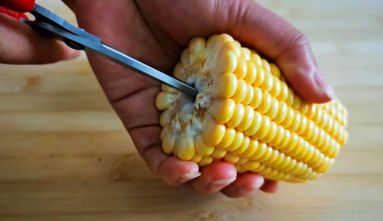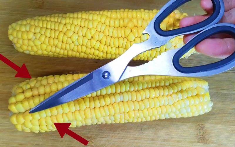 接下来就是重点了,看见玉米中间那个玉米芯没,软软的那个,拿剪刀直接插进去,往深了插,别怕用力,然后左右转动剪刀,就像拧钥匙开锁那样,同时慢慢把剪刀撑开,神奇的事情发生了,整个玉米棒居然裂开了,裂得整整齐齐的,像打开了一个机关!