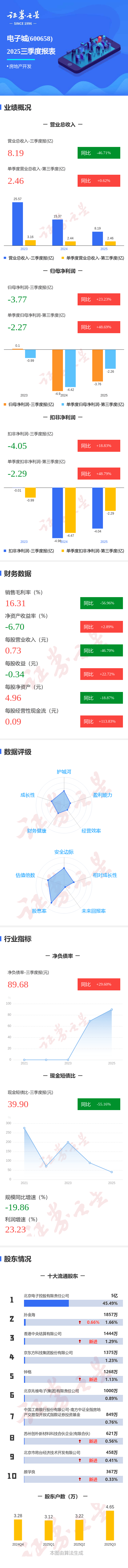 证券之星消息,电子城2025年三季报显示,前三季度公司主营收入8.19亿元,同比下降46.71%;归母净利润-3.77亿元,同比上升23.23%;扣非净利润-4.05亿元,同比上升18.83%;其中2025年第三季度,公司单季度主营收入2.46亿元,同比上升0.62%;单季度归母净利润-2.27亿元,同比上升48.69%;单季度扣非净利润-2.29亿元,同比上升48.8%;负债率64.92%,投资收益1131.65万元,财务费用2.0亿元,毛利率16.31%。