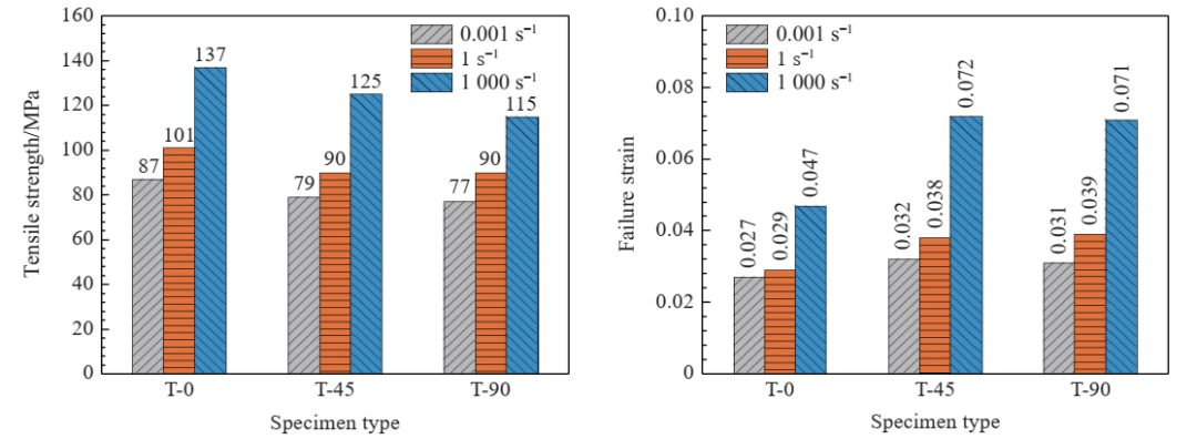 在同一应变率下,玻璃纤维方向为 0°的试件的拉伸强度高于另外两种试件,而破坏应变低于其他两种试件。其中, 同一应变率下,玻璃纤维方向为 45°和 90°的试件的拉伸强度和破坏应变均较为接近,说明玻璃纤维方位角从 0°增至一定角度后再继续增大对试件的拉伸强度和破坏应变的影响不明显。