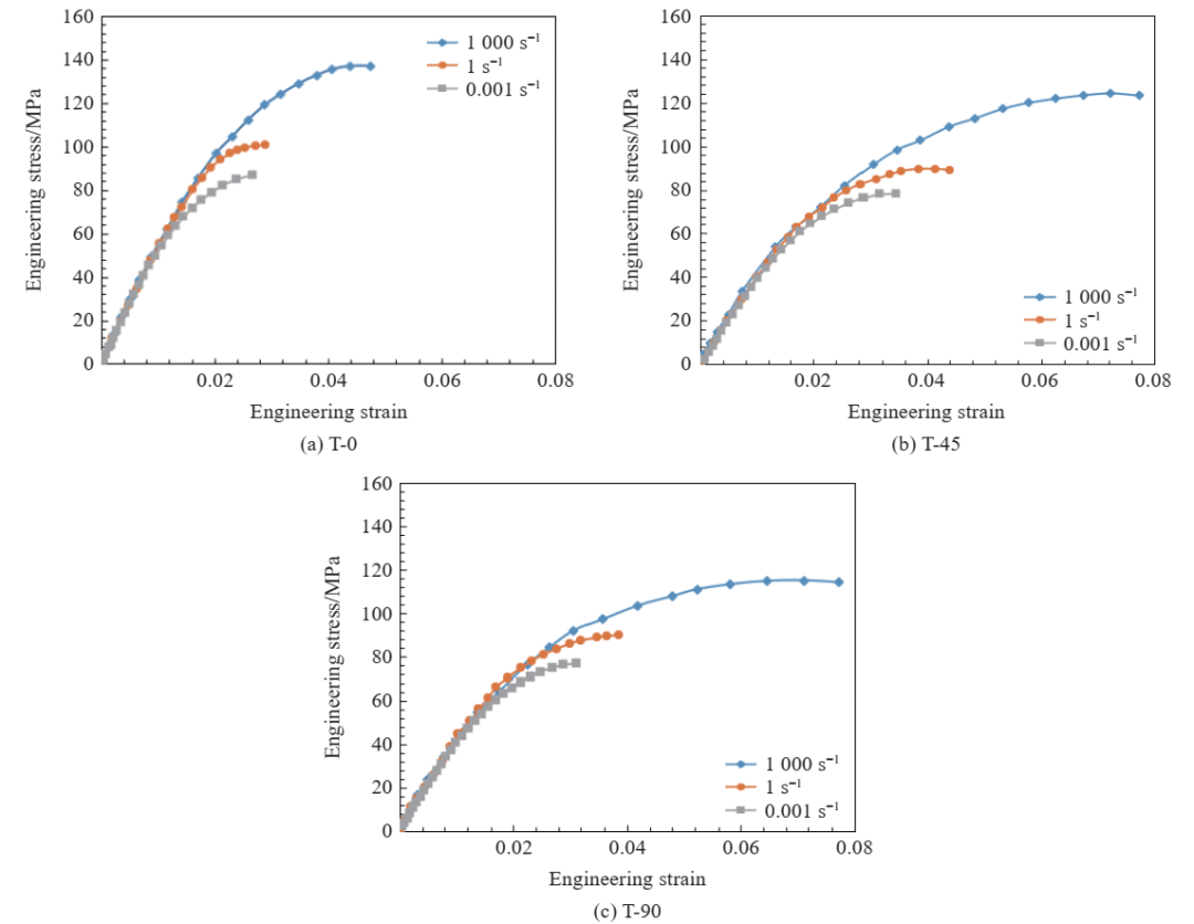 为方便表示,将玻璃纤维方向为 0°、45°和 90°的试件分别编号为 T-0、T-45 和 T-90。 T-0、T-45 和T-90 试件在 0.001~1000s-1范围内的工程应力-工程应变曲线如图6所示。由图 6可知,玻璃纤维方向不同的试件均具有较强的应变率敏感性,表现为随着应变率的升高,拉伸强度和破坏应变均增大。