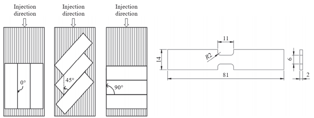制备的平板试样厚度控制在2.0mm,随后按0°(流动方向)、45°和90°(垂直流动方向)三个方向切割成标准测试试样,模拟外壳注塑成型后不同位置的纤维取向状态。