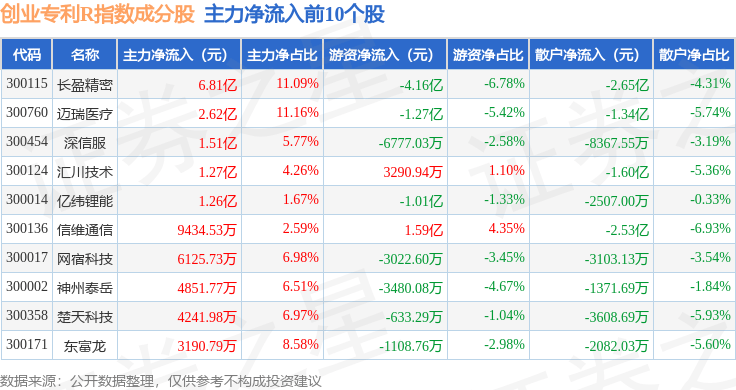 资金流向方面,创业专利R(470068)指数成份股当日主力资金净流出合计16.95亿元,游资资金净流入合计2.28亿元,散户资金净流入合计14.67亿元。成份股资金流向详情见下表: