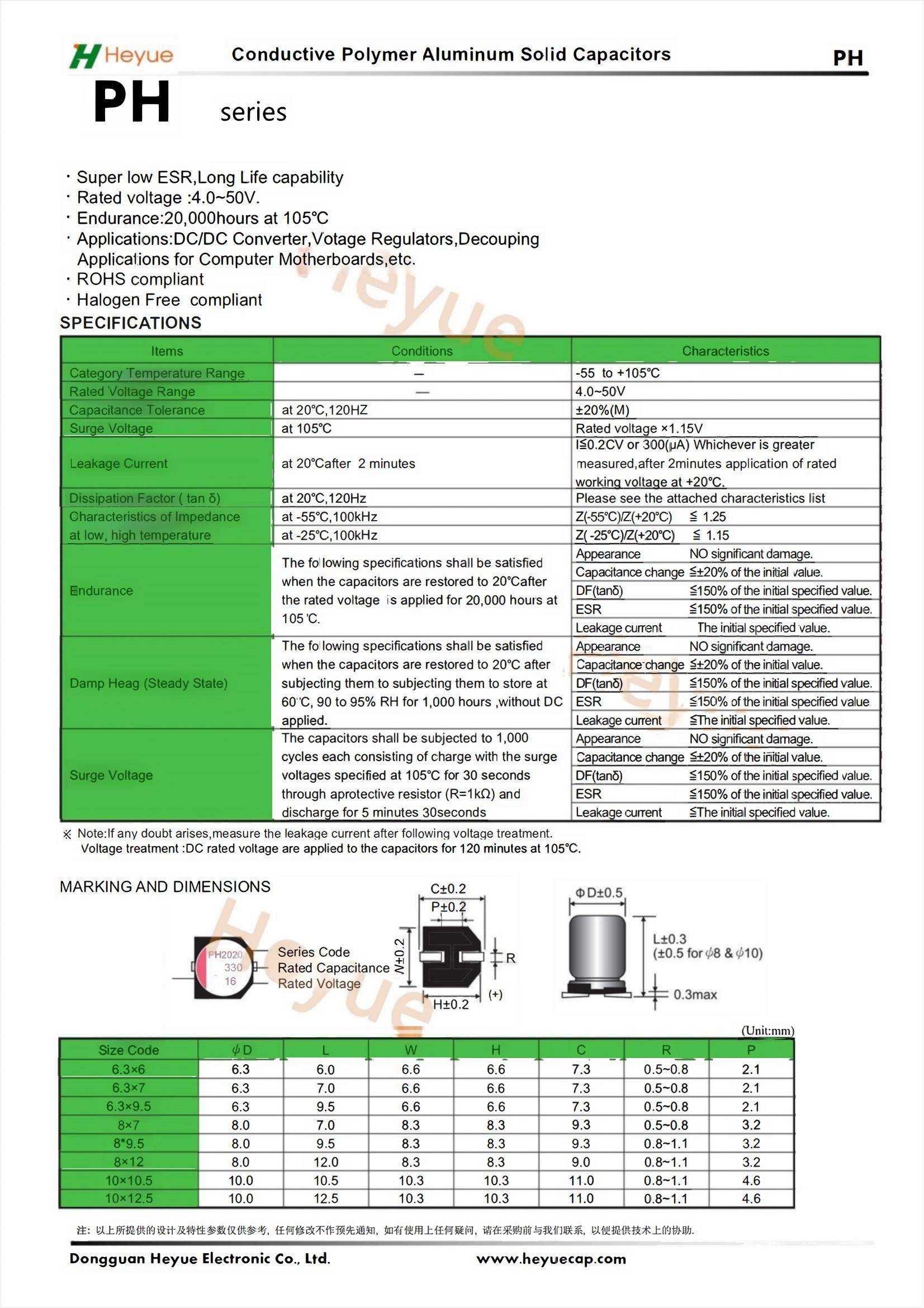 在电子元器件领域,电解电容作为电路设计中不可或缺的被动元件,其性能直接影响电子设备的稳定性和寿命。近年来,随着电子设备向小型化、高密度化发展,传统液态铝电解电容逐渐暴露出体积大、易漏液、寿命短等缺陷。而固态铝电解电容凭借其卓越的电气性能和可靠性,正逐步成为高端电子设备的首选。其中,Heyue固态贴片铝电解电容PH系列以其105℃环境下20000小时的长寿命特性,在工业控制、通信设备、汽车电子等领域展现出独特优势。