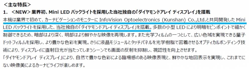 据JVCKENWOOD官方规格书介绍,“本机是业界首款在车载导航显示器上采用了与龙腾光电共同开发的、采用Mini LED背光技术的设备”,一举创下JVCKENWOOD首次公开显示供应商的纪录。
