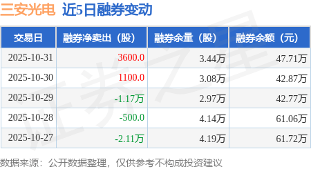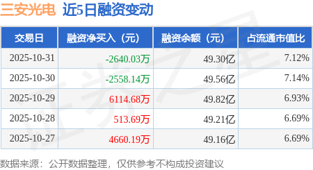 证券之星消息,10月31日,三安光电(600703)融资买入6972.62万元,融资偿还9612.65万元,融资净卖出2640.03万元,融资余额49.3亿元,近20个交易日中有11个交易日出现融资净买入。