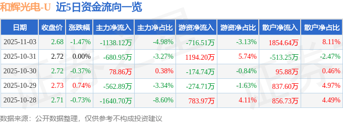 11月3日的资金流向数据方面,主力资金净流出1138.12万元,占总成交额4.98%,游资资金净流出716.51万元,占总成交额3.13%,散户资金净流入1854.64万元,占总成交额8.11%。