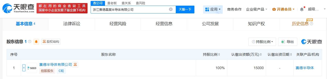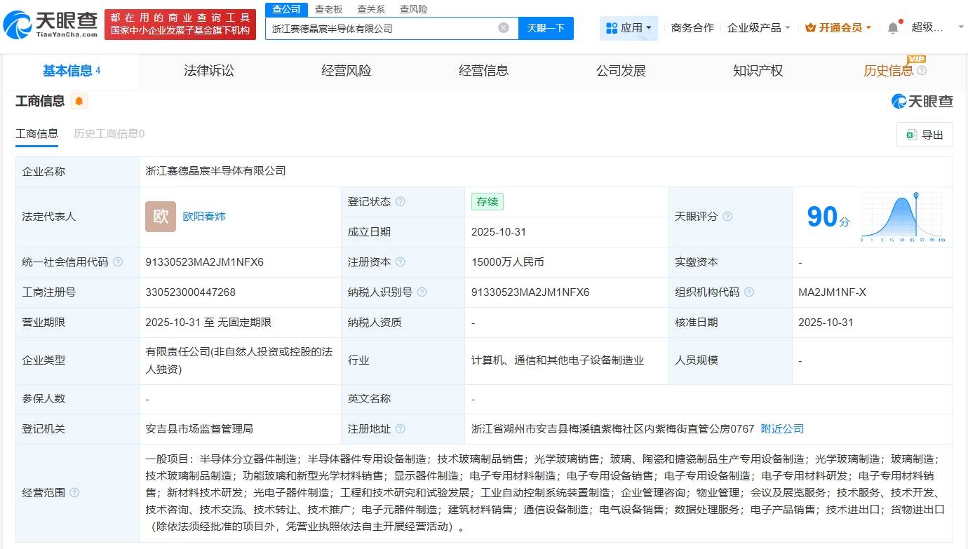 雷达财经讯,天眼查App显示,近日,浙江赛德晶宸半导体有限公司成立,法定代表人为欧阳春炜,注册资本1.5亿人民币,经营范围包括半导体分立器件制造、半导体器件专用设备制造、技术玻璃制品销售、光学玻璃销售等。股东信息显示,该公司由赛德半导体有限公司全资持股。