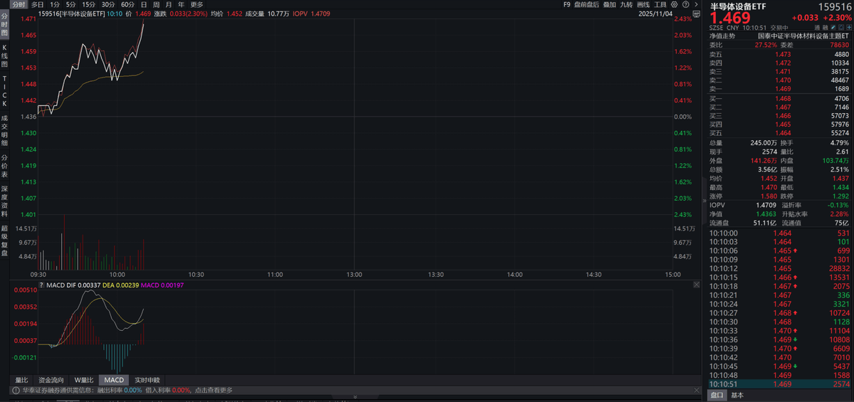 11月4日,聚焦上游最“卡脖子”的半导体设备领域的半导体设备ETF(159516)领涨超2%。资金持续抢筹,半导体设备ETF(159516)年初以来份额增长超200%,当前规模超70亿元,居同类产品第一。
