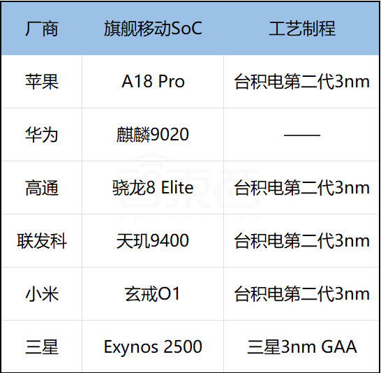 ▲六大主流手机AI芯片厂商旗舰SoC及工艺情况
