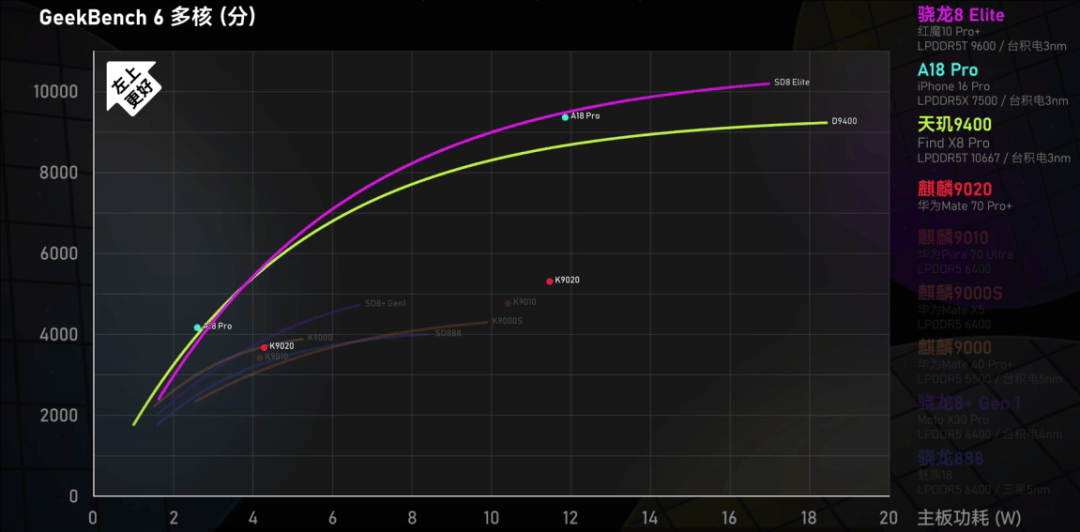 ▲ CPU多核能效曲线(红色圆点为麒麟9020,紫色、绿色曲线为高通、联发科旗舰芯,时间为2024年12月),来源:极客湾Geekerwan